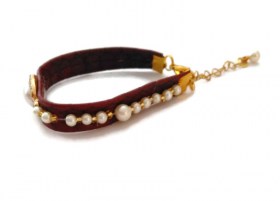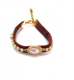 Χειροποίητο βραχιόλι σε καφέ δερμάτινο λουράκι με πέρλες